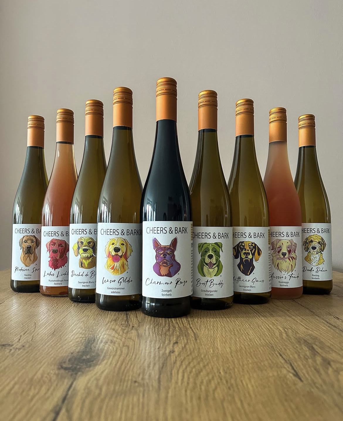 Du kannst im Schnauz den Wein von cheers&bark erwerben. Es gibt 10 einzigartige Sorten und jede Flasche erzählt ihre Geschichte mit liebevoll gezeichnetem Hundeporträts. Ein Teil des Erlöses unterstützt Tierheime in Deutschland. Perfekt als Geschenk für alle Hundemenschen.
